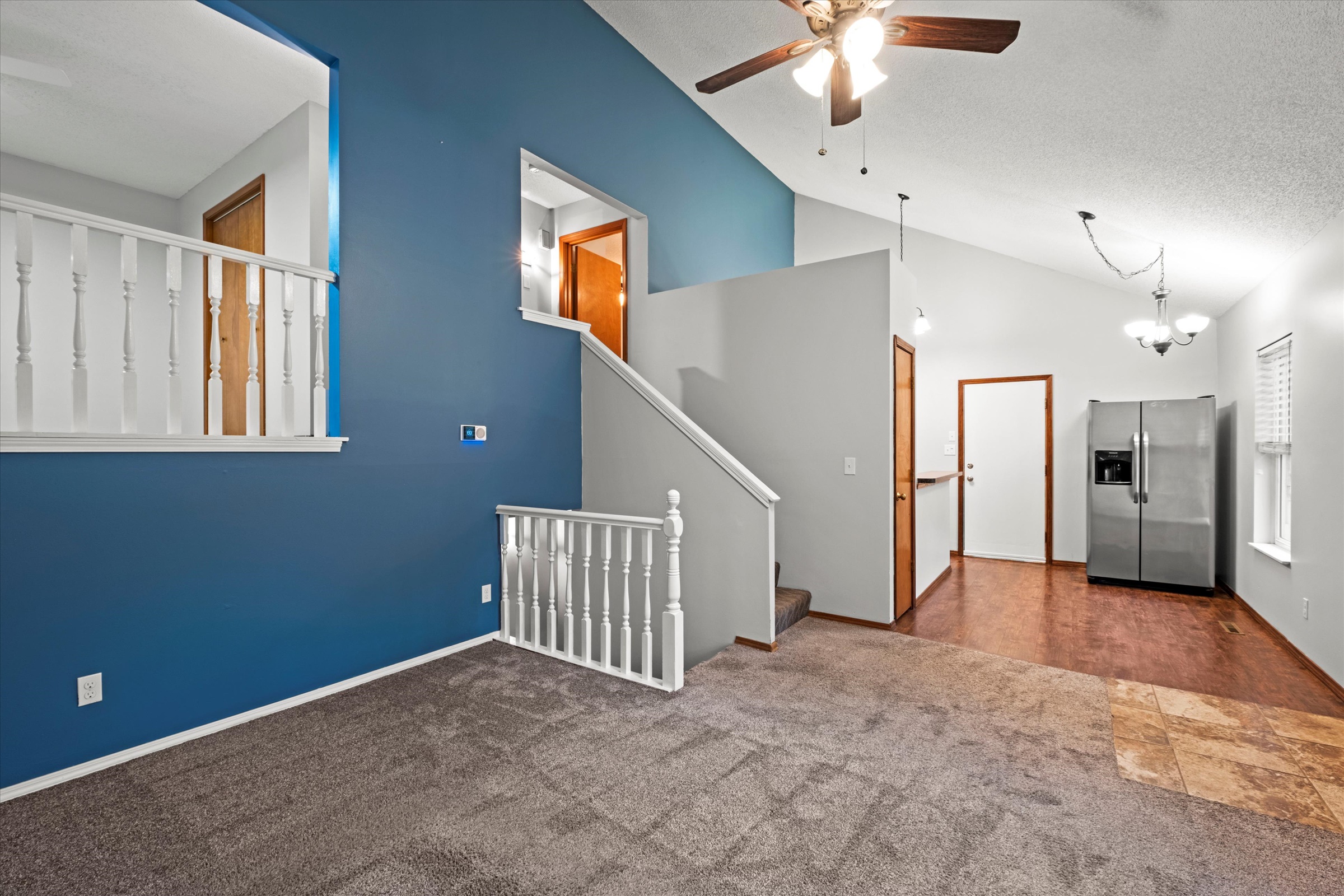 Perfectly sized and conveniently located in charming Merriam, this home is updated and features fresh interior paint and freshly cleaned carpets. All that’s missing is you! The open floor plan on the main level offers an easy flow between the kitchen/dining area and the living room, and the vaulted ceilings and openness to the loft area upstairs make it feel airy and bright. Two bedrooms and a full bath on the upper level, plus a primary suite with TWO walk-in closets and a private bath in the lower level provide just the right amount of space. The fenced backyard is complete with a fire pit, and you can’t beat the location with close highway access and just minutes away from Merriam Stations and other popular spots in north Johnson County. This would make a great owner-occupied purchase or fantastic addition to your rental portfolio! Welcome home.