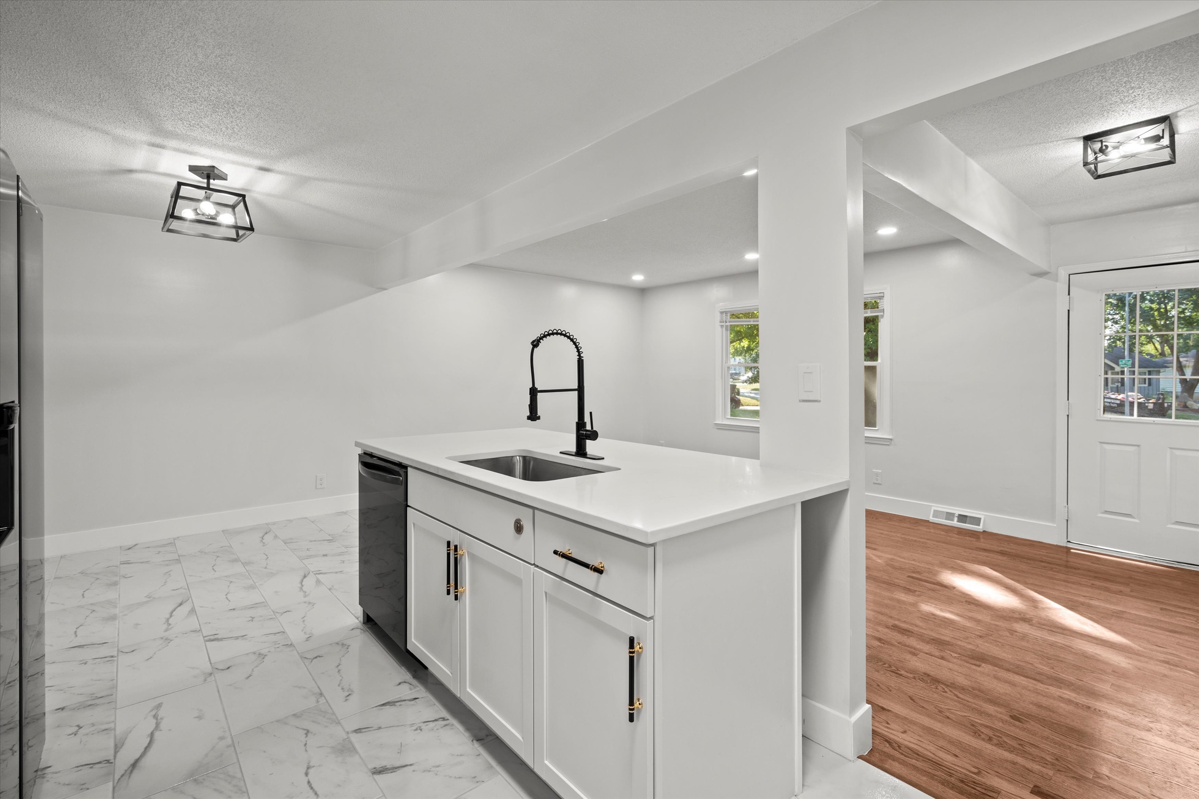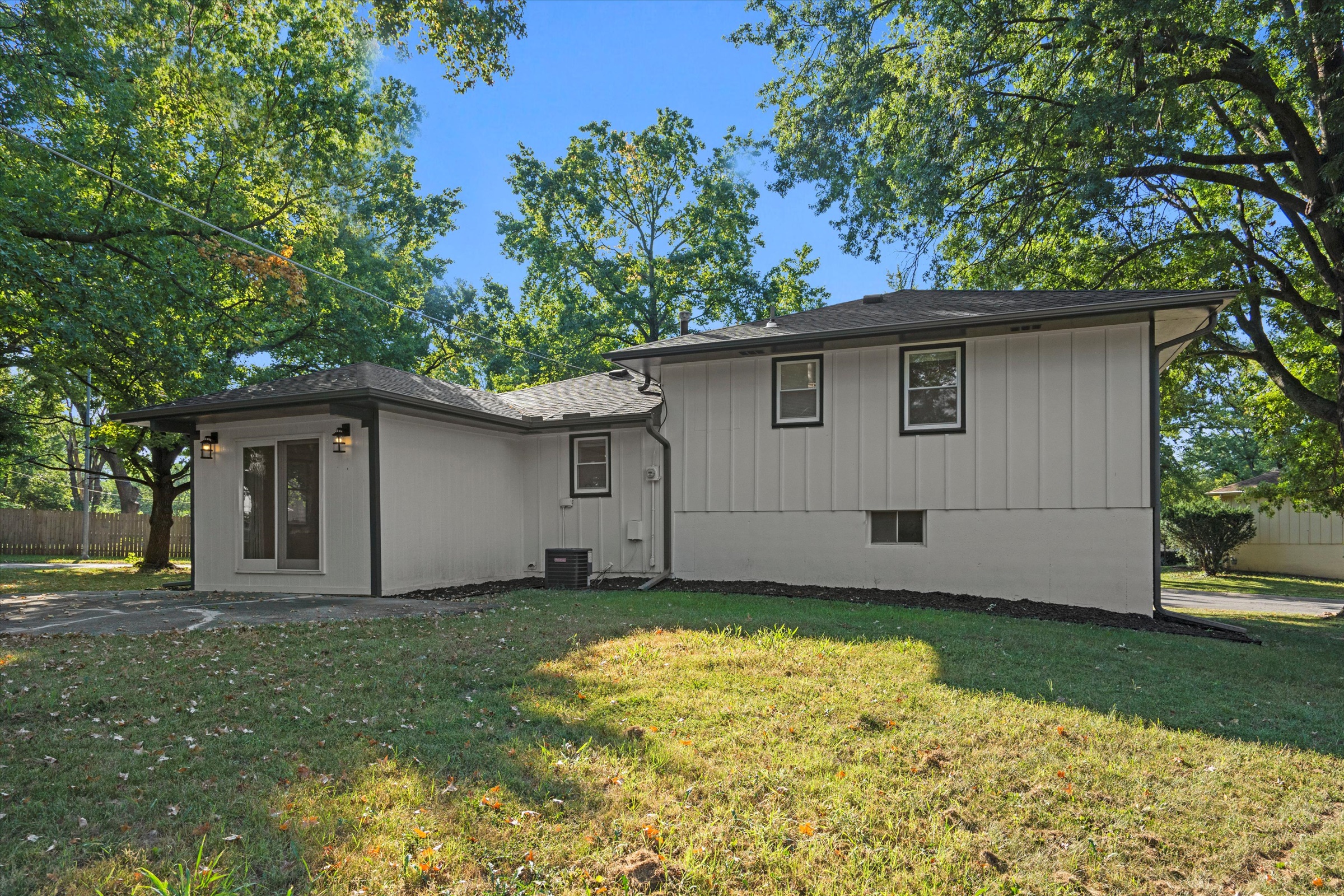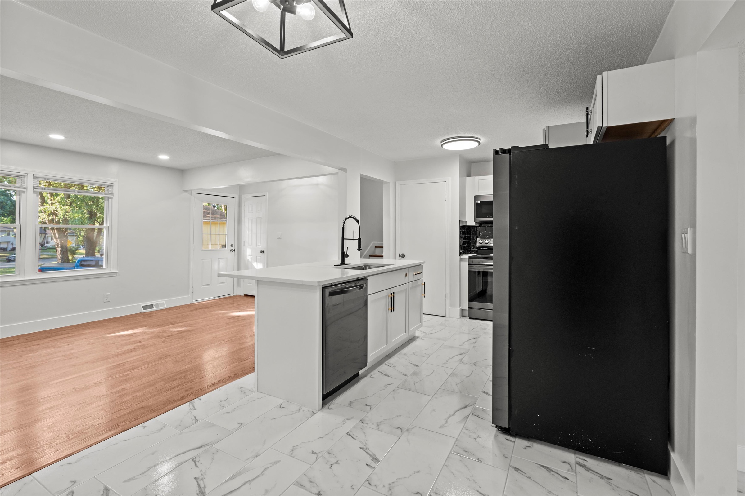 Beautifully redone side-to-side split with an open floor plan and sophisticated finishes throughout! The main living area flows effortlessly between the spacious living room and the stylish black-and-white kitchen, complete with a large island, ample cabinet storage, gleaming quartz countertops, and all new dark stainless steel appliances. The dining room opens up to the back patio and yard, making it easy to enjoy dinner indoors or al fresco. The primary bedroom has a private ensuite half-bath, and a large full bath with a double vanity and spacious shower plus two more bedrooms complete the bedroom level. Downstairs, the spacious unfinished basement is clean and painted so you can easily create additional living space with some rugs, furniture or a game table, or enjoy having plenty of clean and dry storage. Convenient location close to parks, schools, highway access and more. Welcome home!